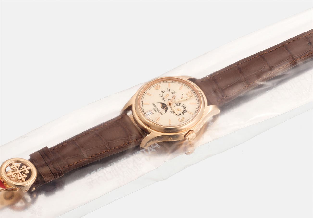 百達翡麗,精細,18K紅金自動上弦腕錶,配年曆、中心秒針﹑月相顯示及動力儲存,型號5146,原廠封套,2015年製