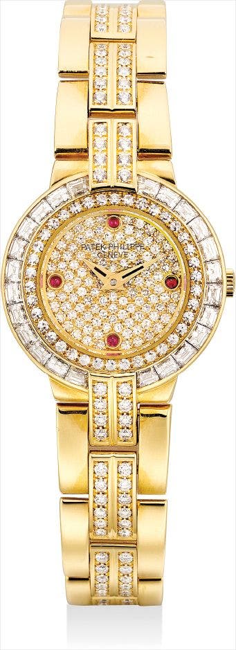 百達翡麗,精細及罕有,18K黃金鑲鑽石及紅寶石,女裝石英鏈帶腕錶,型號4785/11,1989年製