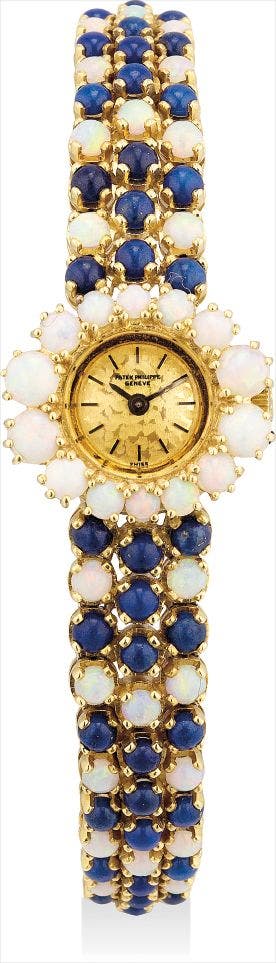 百達翡麗,極精細及罕有,18K黃金鑲蛋白石及青金石,女裝鏈帶腕錶,型號4011/1,1978年製