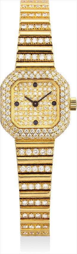 百達翡麗,非常精細及罕有,18K黃金鑲鑽石及藍寶石,女裝正方形鏈帶腕錶,型號4628/5,1986年製