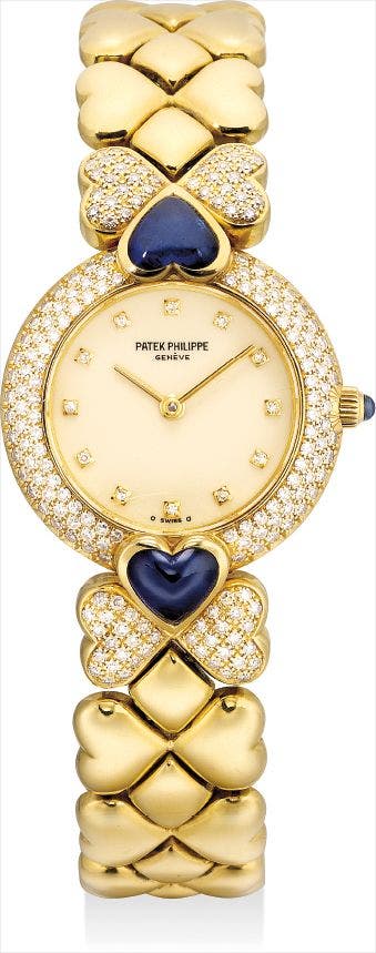 百達翡麗,精細及罕有,18K黃金鑲鑽石及藍寶石,女裝石英鏈帶腕錶,型號4828/11,1991年製