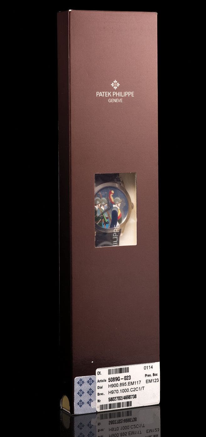 The present reference 5089G-023 wristwatch features a finely crafted cloisonné dial depicting three soldiers from the Escalade celebrations. The cloisonné dial with hand-engraved background display strong vibrant colours and perfectly illustrates the most popular festival in Geneva. The watch is produced as a set of three to commemorate the heroic victory in 1602, when the people of Geneva repelled an attack by the Duke of Savoy. Further enhancing the present limited series, the watch is set with sapphire crystal case back protected by a hinged dust cover engraved with 'Patek Philippe Geneve 175e Anniversaire 1839-2014'.