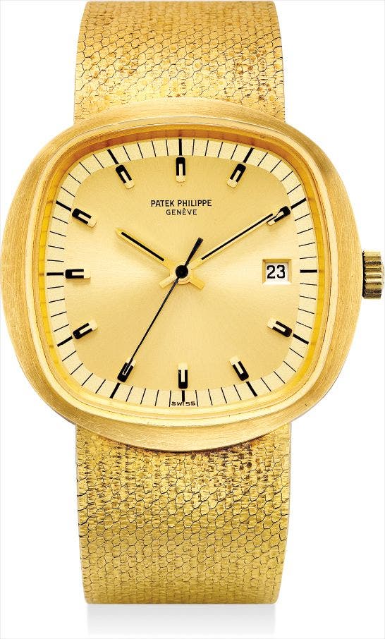 百達翡麗,精細及罕有,18K黃金枕形石英鏈帶腕錶,配中心秒針、日曆顯示及雙色香檳色錶盤,型號3587/1,1971年製