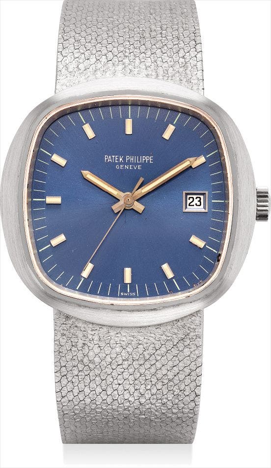 百達翡麗,精細及非常罕有,18K白金枕形鏈帶腕錶,配中心秒針及日曆顯示,型號3587/1,1971年製
