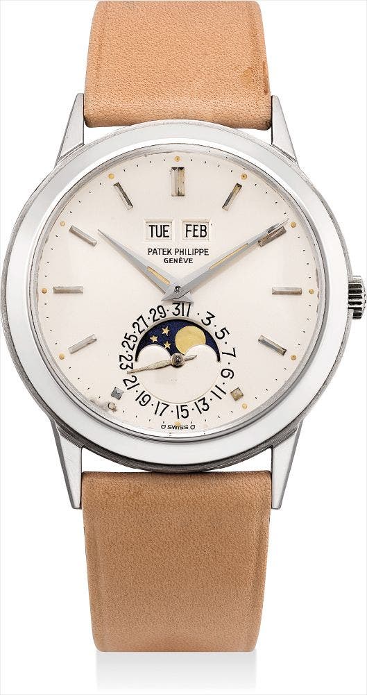 百達翡麗,極精細及罕有,18K白金自動上弦腕錶,配萬年曆、月相顯示及夜光數字,型號3448,附證書及盒子,1974年製
