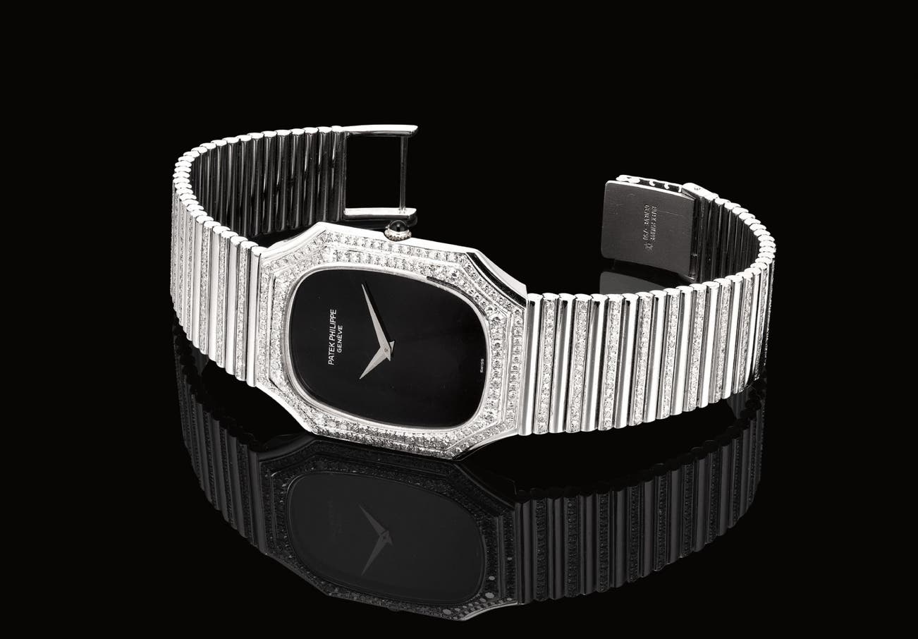 百達翡麗,精細,18K白金鑲鑽石枕形鏈帶腕錶,配黑瑪瑙錶盤,型號3729/1,1978年製