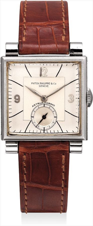 百達翡麗,精細及罕有,不銹鋼正方形防水腕錶,配雙色錶盤及獨特錶耳,型號1485,由Astrua Torino銷售,1941年製