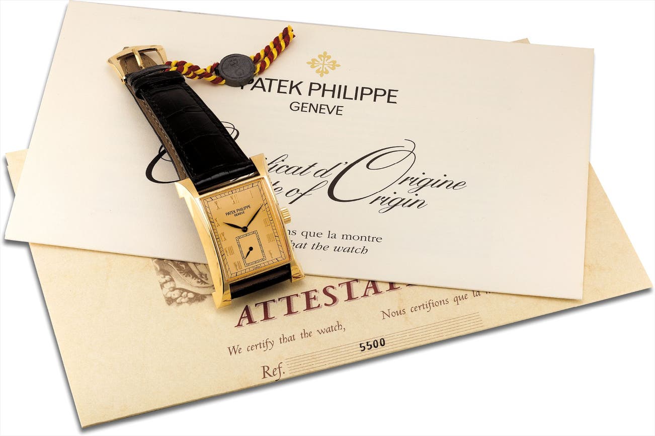 百達翡麗,精細及罕有,18K黃金長方形腕錶,“Pagoda”,型號5500,限量生產,為慶祝百達翡麗日內瓦製錶中心開幕於約1997年製
