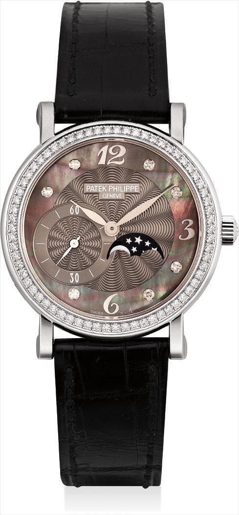 百達翡麗,18K白金鑲鑽石女裝腕錶,配貝母錶盤及月相顯示,型號4958,2009年製