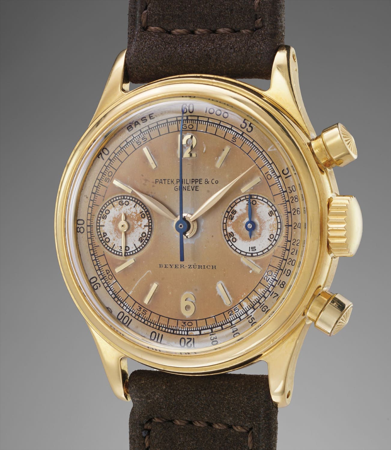 However, where the present lot redefines scholarship is the shape of its lugs. Reference 1463 models in steel feature straight lugs whereas gold models have down turned lugs. The present gold model has the same straight lugs as found in steel models. It is possible that whilst looking for a chic yet versatile waterproof gold chronograph, Beyer was approached and the present reference 1463 ordered. No earlier yellow gold reference 1463 being known, it is safe to assume that Patek Philippe used the design of the existing steel reference 1463 to create this watch and at a later date modified the lug design, differentiating the steel and gold models.