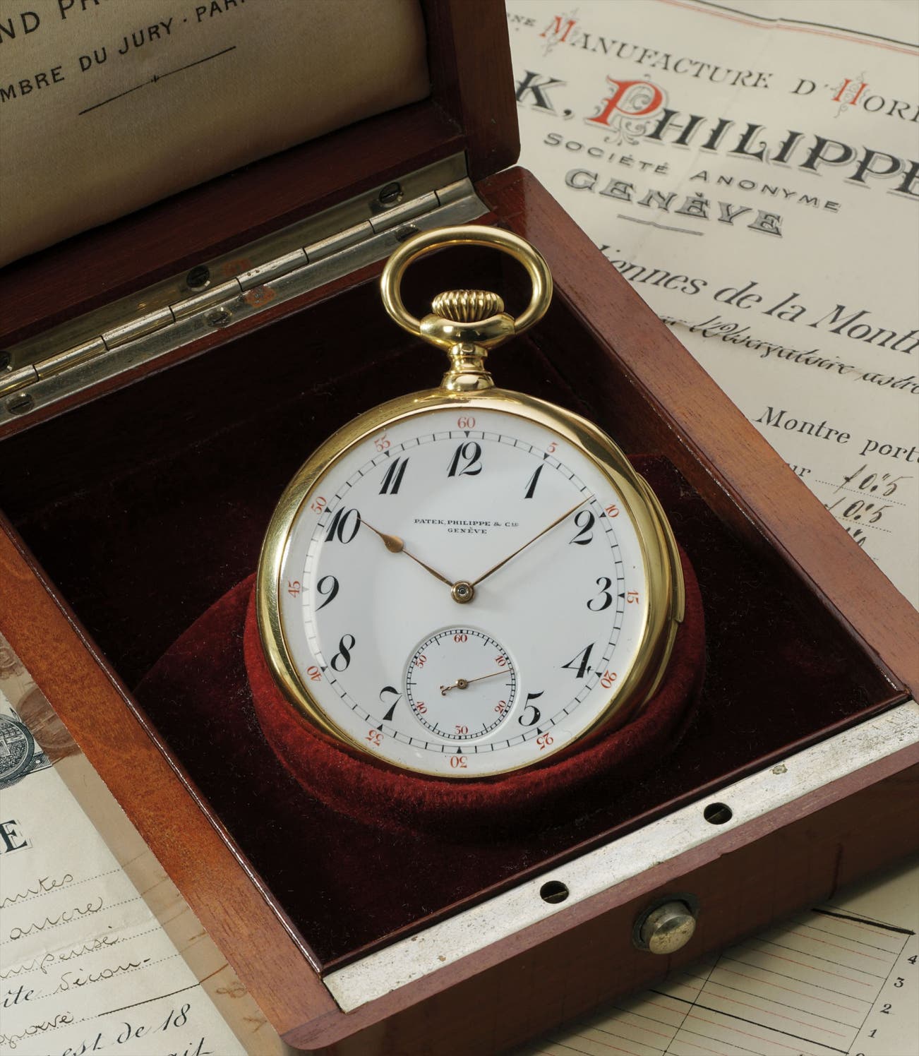 The generous case size enhances the deep and crystalline chimes. Enhancing the general desirability of this timepiece is the fact that it comes full with original fitted box, original Certificate of Origin and Guarantee as well as rate results ("relevé de marches quotidiennes)" undertaken by Patek Philippe and dated October 25, 1913.