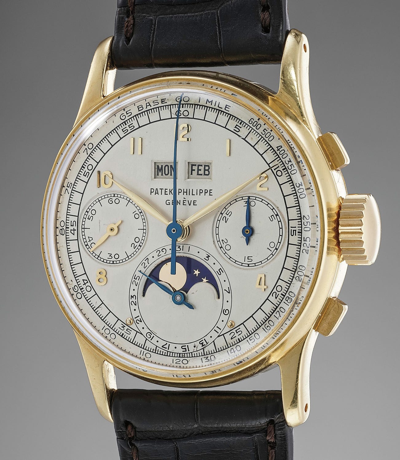 The dial is preserved in equally impressive condition as it has gracefully aged over time. Reference 1518 dials are notorious for tarnishing heavily due the model's snap-on bezel and caseback, which allowed moisture to seep through. However, this particular dial has aged to a warm ivory tone and has incredible charisma. The enamel signature remains thick and defined, with the accent above the "e" in "Genève" strong and present. The fat, wide and sharp aperture windows at 12 o’clock are a distinguishing feature of the later generation reference 1518s, their definition and crisp edges attesting to the dial’s purity.