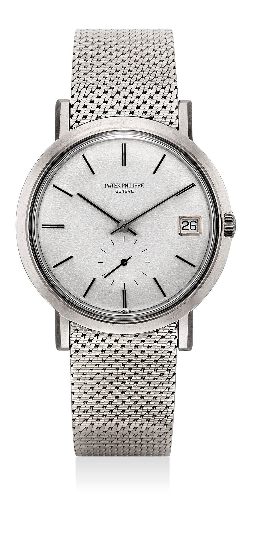 百達翡麗,型號3541 ,精細罕有,18K白金自動上弦鏈帶腕錶,配日期顯示和Gay Frères鏈帶,約1969年製。附後補證書