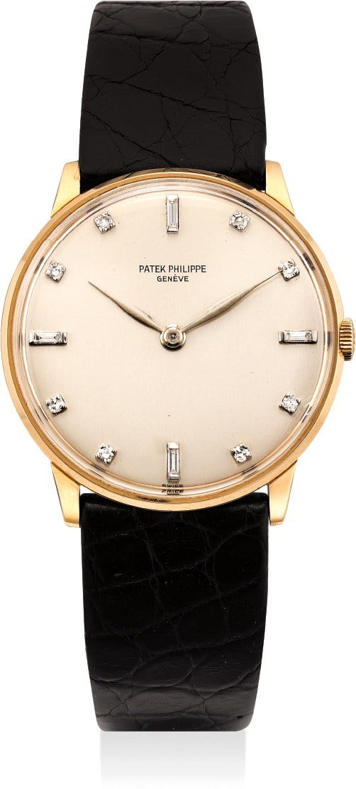 百達翡麗,型號2573/1,精細和十分罕有,18K玫瑰金腕錶,配鑽石時標錶盤,約1964年製。附後補證書