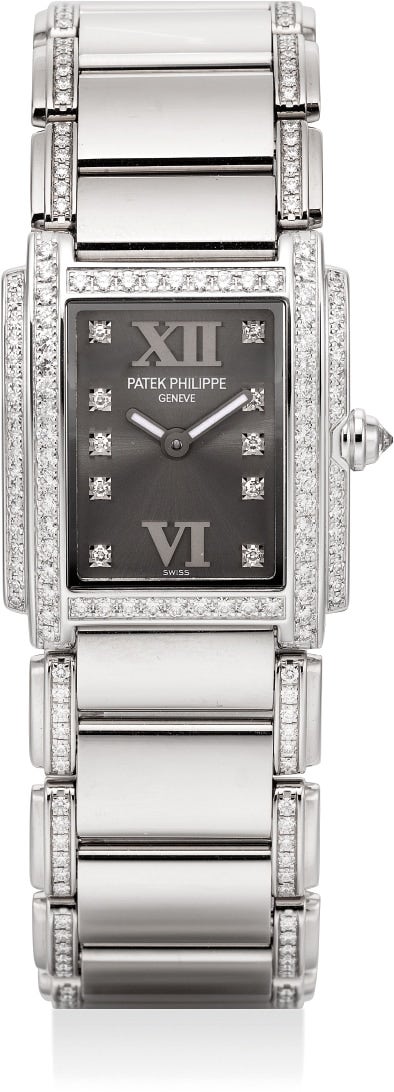 百達翡麗,型號4908/310G,女裝18K白金鑲鑽石英鏈帶腕錶,約2005年製。附錶盒和原裝證書