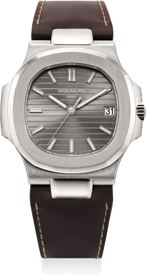 百達翡麗,「Nautilus Jumbo」型號5711G,18K白金自動上弦腕錶,配日期顯示,約2009年製。附錶盒、原裝證書、備用原廠皮帶