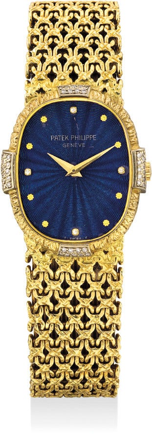 百達翡麗,「Gold Ellipse」型號4307/1,18K黃金鑲鑽鏈帶腕錶,配藍色扭索紋琺瑯錶盤,約1982年製。附後補證書