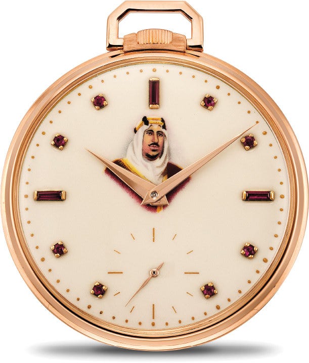 百達翡麗,型號600/1,非常精細,18K玫瑰金懷錶,配紅寶石時標和象牙色琺瑯錶盤,繪有沙地阿拉伯國王IBN SAUD肖像,約1955年製。附後補證書