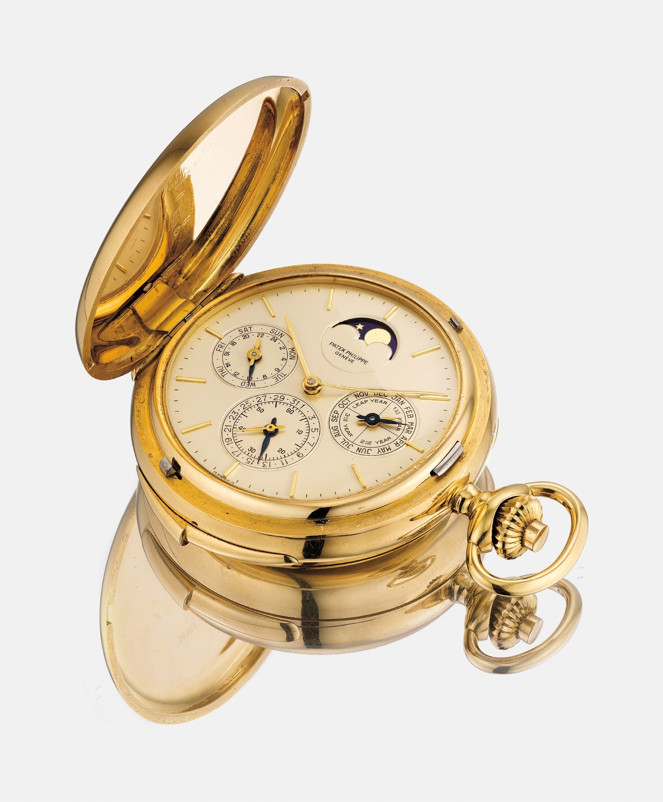 百達翡麗,型號881,重要及極度罕有,18K黃金獵殼懷錶,配三問、萬年曆、月相和24小時顯示,約1978年製。附錶盒和後補證書。來源:瑞士重要私人收藏