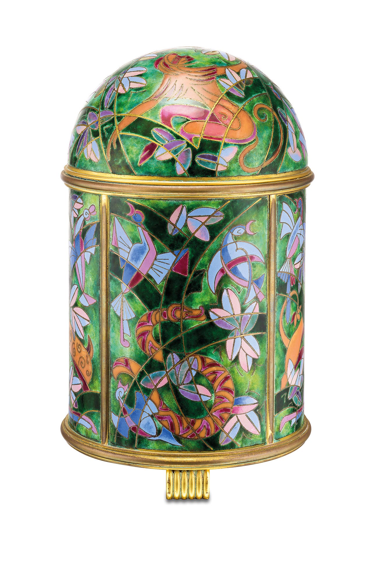 百達翡麗,非常精細及獨一無二,黃銅鍍金掐絲琺瑯太陽能圓頂座鐘「熱帶叢林」,約1957年製。附原裝盒和原裝證書。