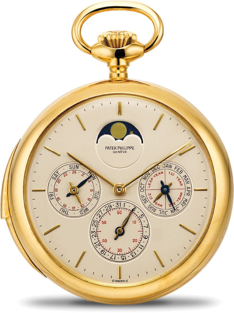 百達翡麗,型號880,罕有及十分重要,18K黃金懷錶,配三問、萬年曆和月相顯示,約1981年製。附原裝證書