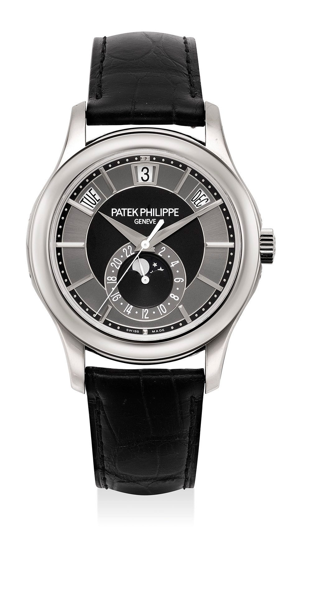 百達翡麗,型號5205,精細及罕有,18K白金自動上弦腕錶,配年曆、月相和24小時顯示,約2013年製。附錶盒和原裝證書