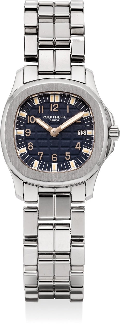百達翡麗,型號4960,精細及極度罕有,女裝精鋼石英鏈帶腕錶,配日期顯示和藍色錶盤,特別為日本市場製作,約1998年製。附錶盒、原裝證書和備用錶帶 根據學者的研究資料顯示,目前為止百達翡麗型號4960,連本拍品據知只有14枚曾現身拍賣市場,十分稀有