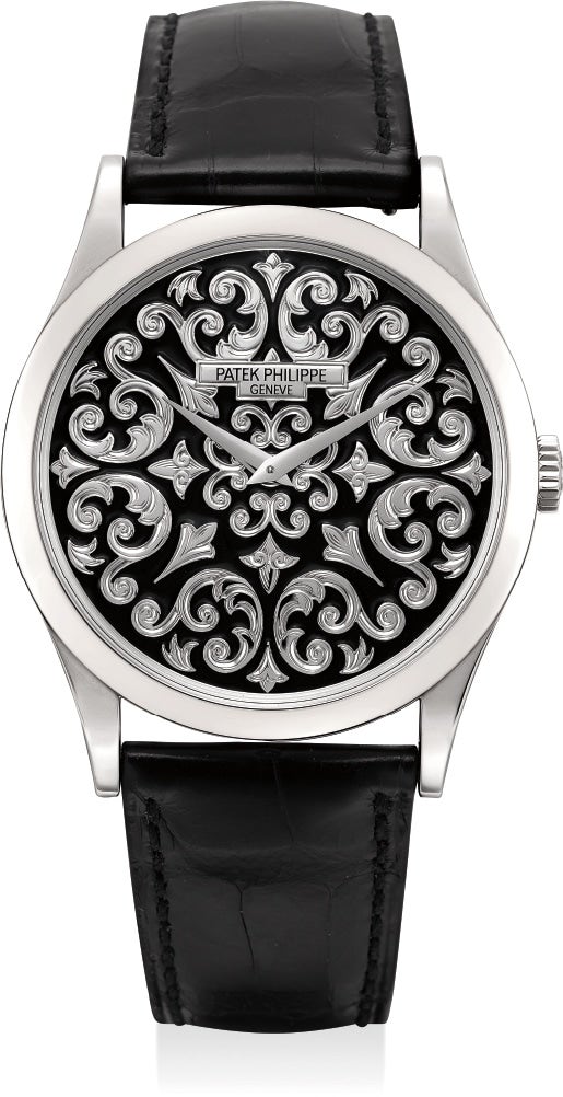 百達翡麗,型號5088P,十分精細及罕有,鉑金自動上弦腕錶,配內填琺瑯雕刻錶盤,約2014年製。附錶盒和原裝證書