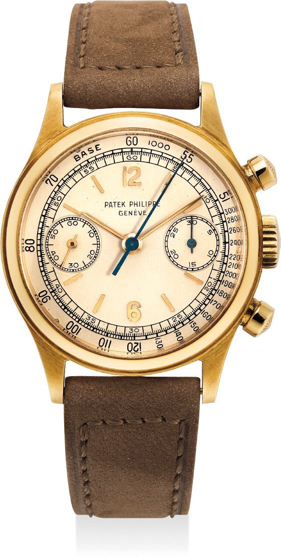 百達翡麗,型號1463,非常精細及罕有,18K黃金腕錶,配計時功能和旋入式後底蓋,約1953年製。附後補證書