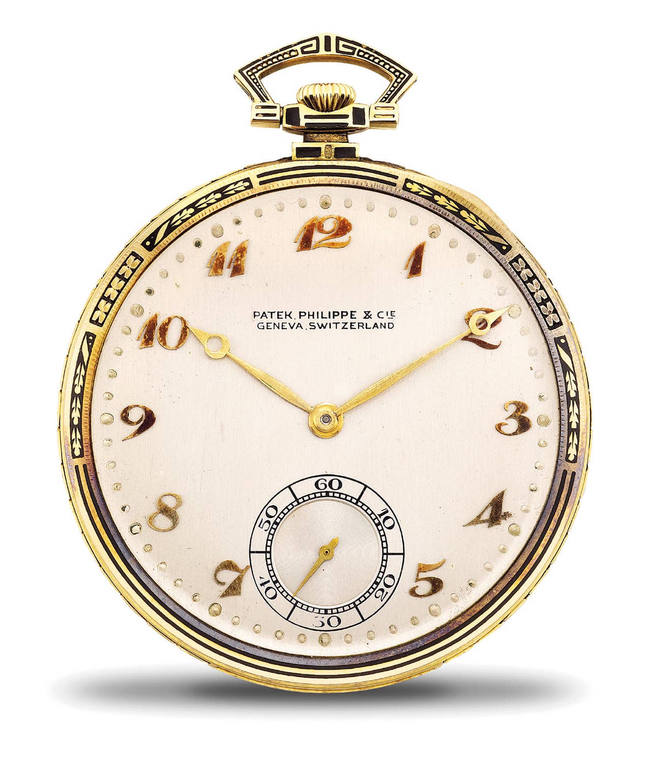 百達翡麗,精細,18K黃金精雕及黑色琺瑯懷錶,配寶璣字錶盤和寶璣時、分針,1924年製。附原裝古董百達翡麗錶盒、原裝證書、後補證書、備用鏡面