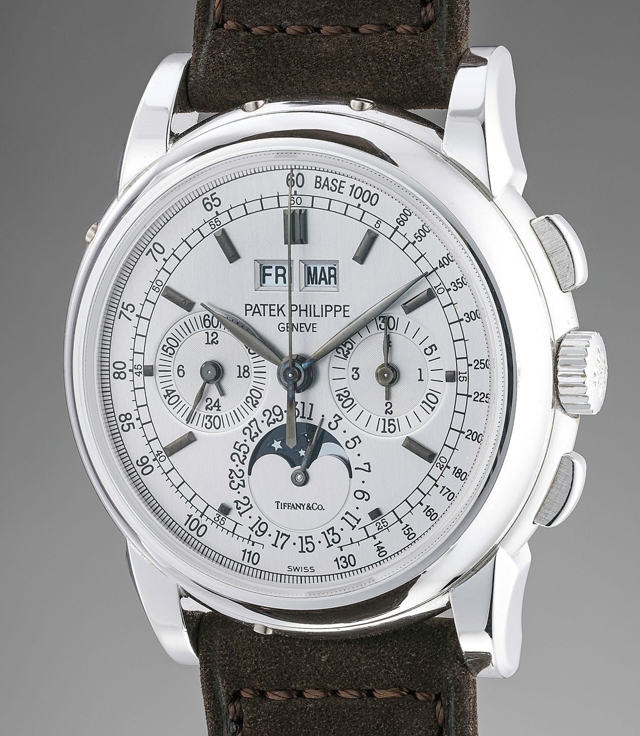 A very fine and extremely rare white gold perpetual calendar chronograph wristwatch with moonphases, Certificate and box, retailed by Tiffany & Co.