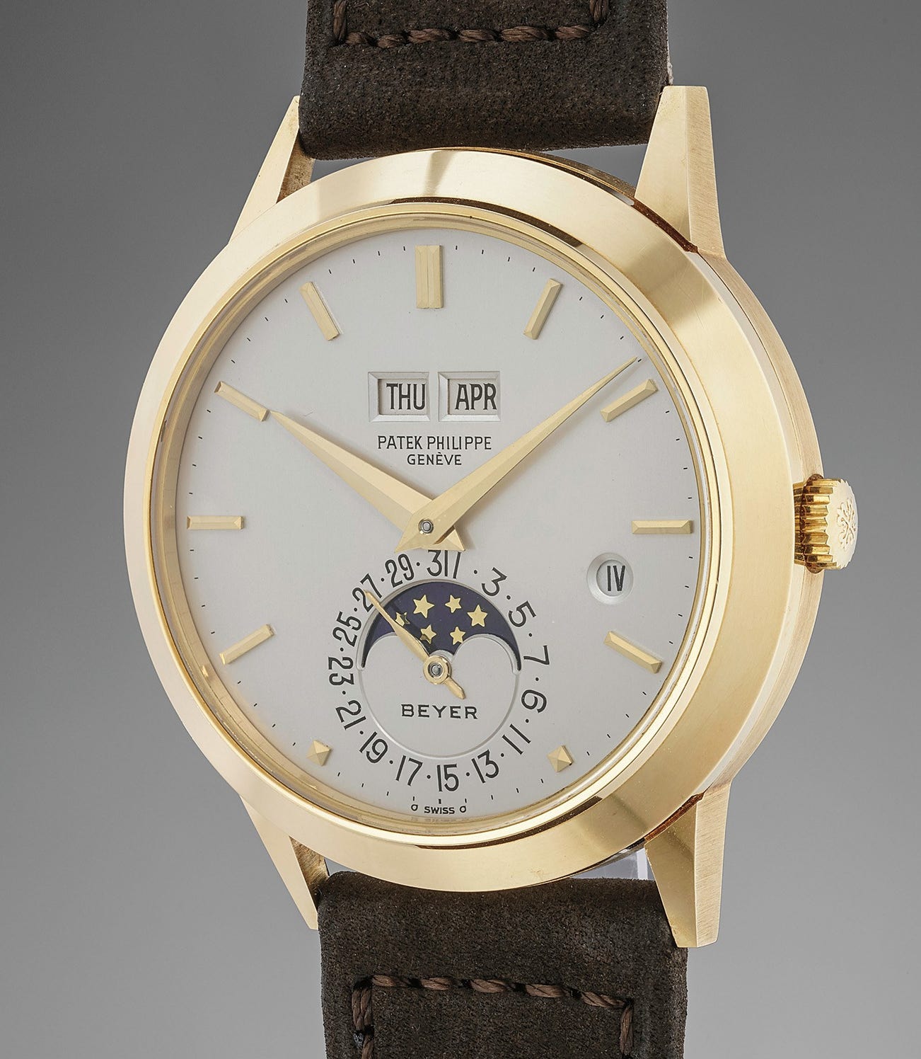 Underneath the moonphase display is the prestigious Beyer signature. The retailer Beyer Chronometrie, founded in 1760 by Matthias Beyer, presently located in Zürich since 1927, has been a preeminent destination for those seeking the finest luxury watches for over two hundred years. Producing their own honey in beehives located on the roof of their exclusive location, Beyer has a world-class watch and clock museum on premises. Having sold Patek Philippe timepieces since 1842, it is natural then that Beyer was one of the few retailers allowed to print their name on a Patek Philippe dial.