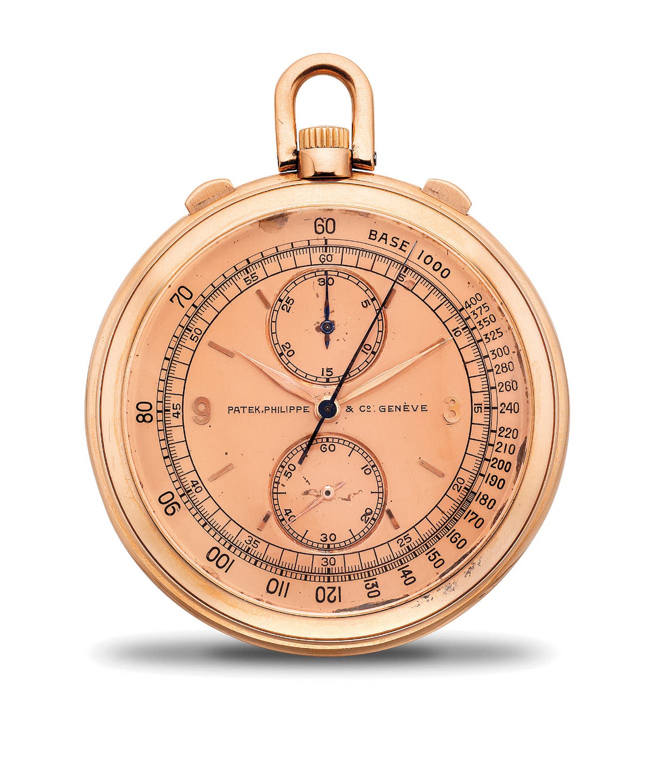 百達翡麗,型號685,精細及十分罕有,18K玫瑰金計時懷錶,玫瑰金色燒青字錶盤,1941年製。附後補證書 據專家研究,百達翡麗型號685計時懷錶,僅於1930年代生產極少數量,據資料記載,目前僅知5枚玫瑰金版本,「Pink on Pink」玫瑰金錶殼加玫瑰金色面盤的配置,罕見珍貴。