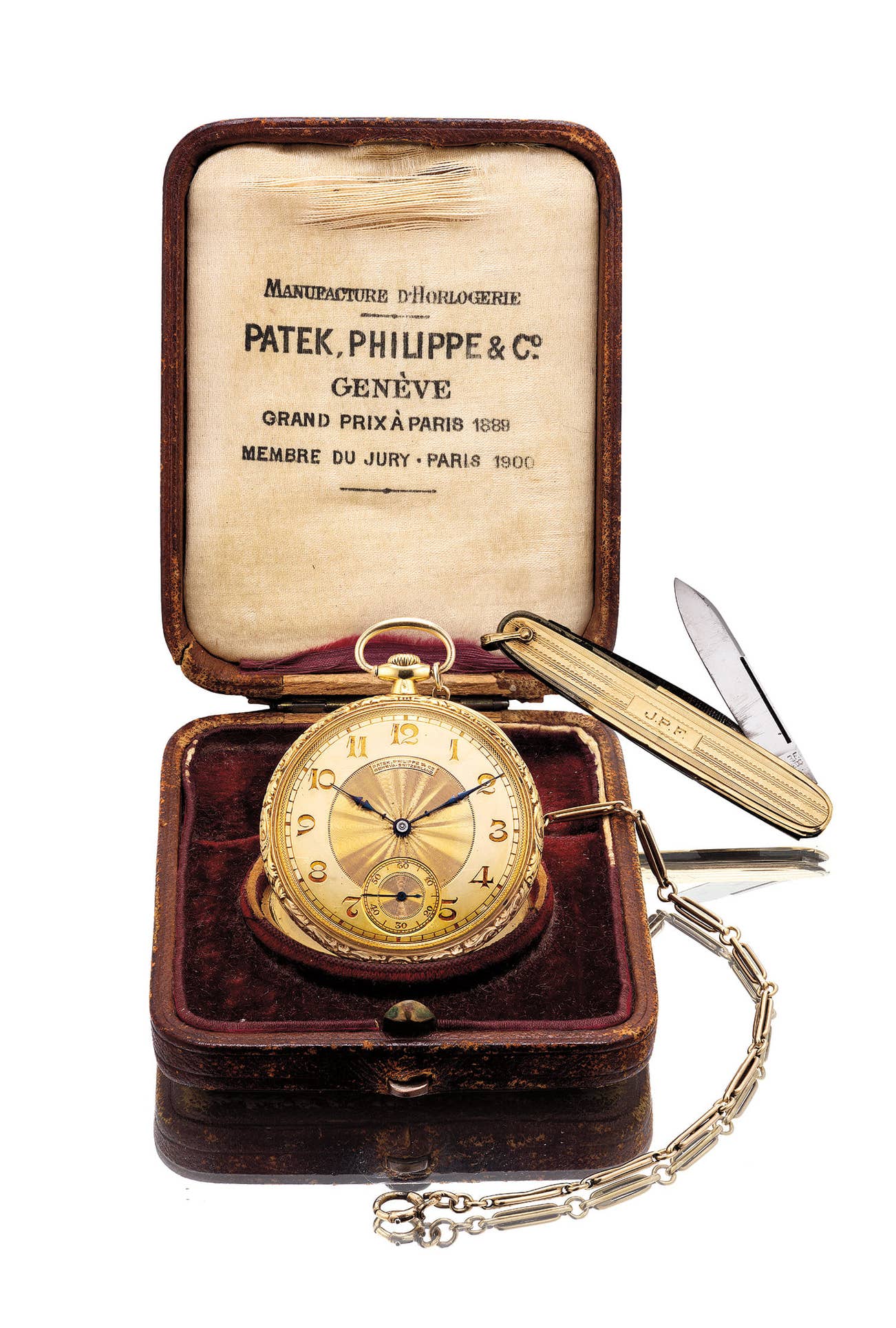 百達翡麗,精細及十分罕有,18K黃金金雕獵殼懷錶,機鏤放射紋錶盤配人手金雕時標,1921年製。附有原裝古董百達翡麗錶盒、14K金雕開錶刀、鍍金錶鏈、附後補證書。 原配錶盒、開錶刀和懷錶獵蓋上,分別印有或刻有原始物主J.P.F.名字及縮寫,物主細心保存、十分難得及珍貴。