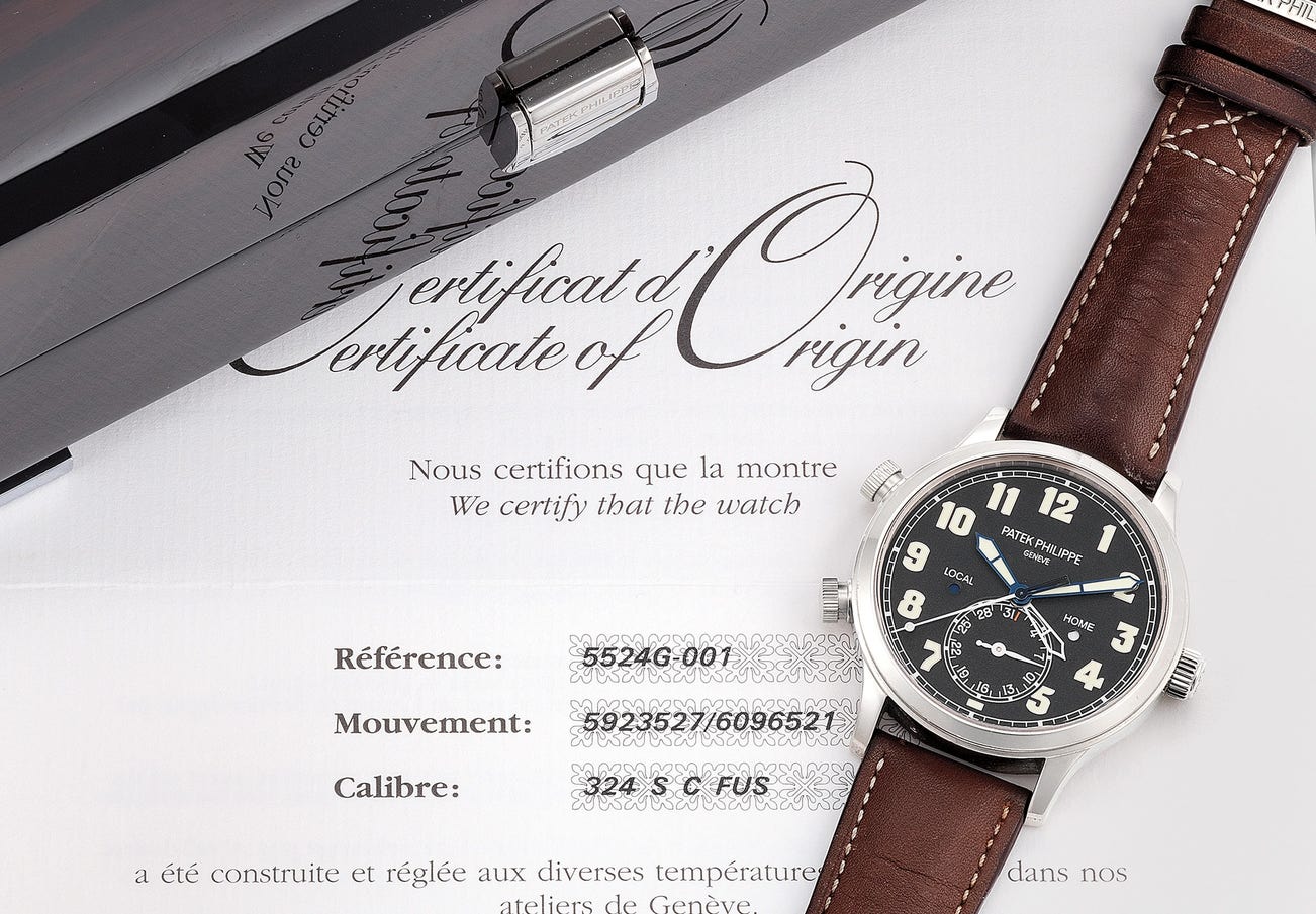 百達翡麗,型號5524G-001,非常精細,18K白金自動上弦腕錶,配兩地時區和日期顯示,約2015年製。附原裝錶盒和原裝證書