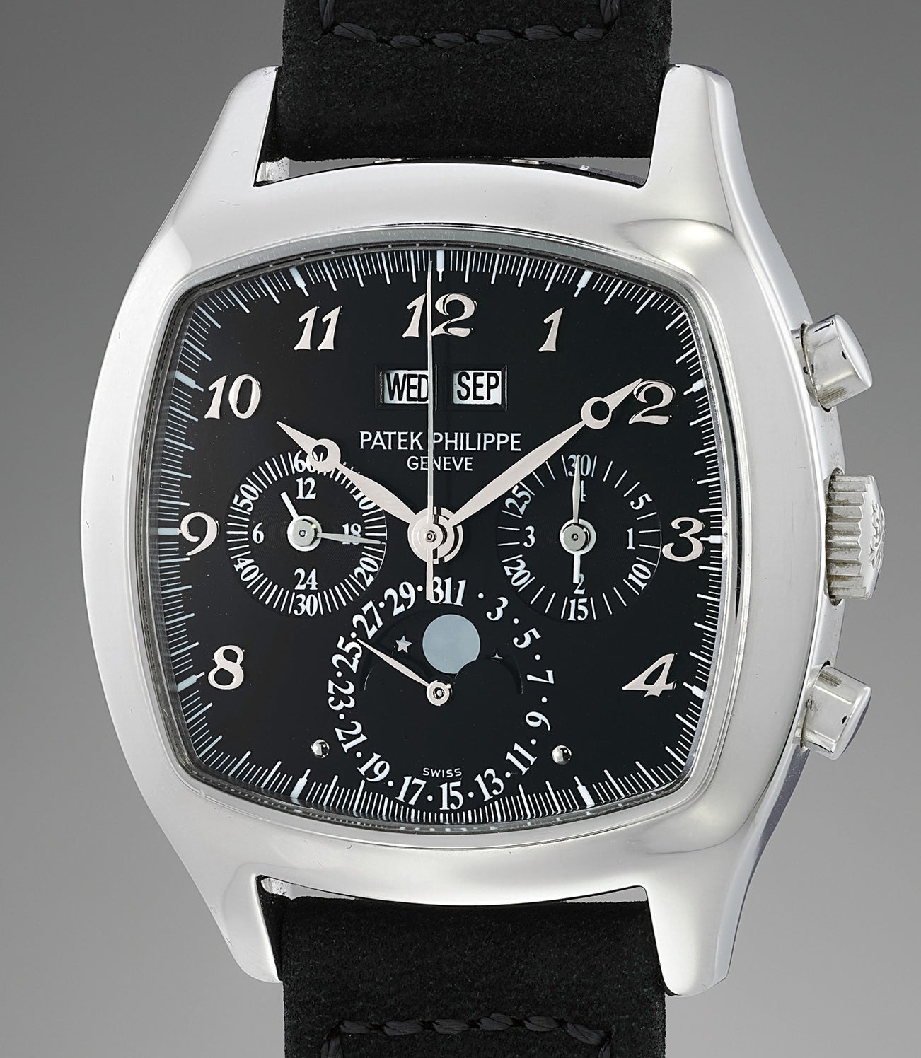 An impressive and most probably unique cushion shaped platinum perpetual calendar chronograph wristwatch with moonphases, black dial and Breguet numerals
