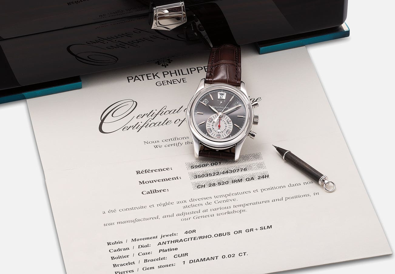 百達翡麗,型號5960P,精細,鉑金自動上弦腕錶,配年曆、飛返計時、日夜顯示、動力儲存功能,2008年製。附原裝錶盒、原裝證書、調整筆
