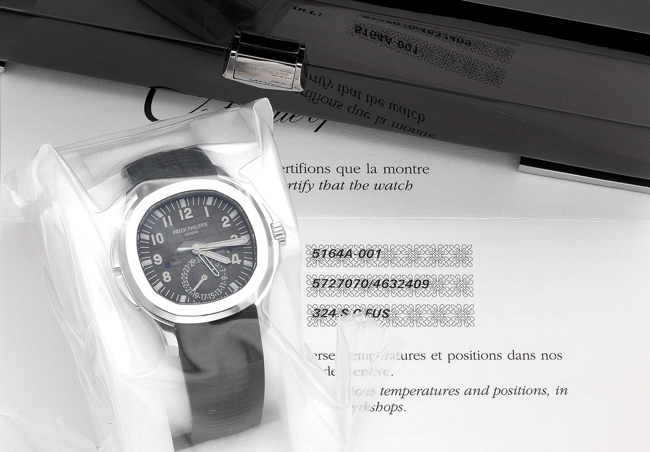 百達翡麗,型號5164A-001,罕有及精細,精鋼自動上弦腕錶,配兩地時間、中心秒針、日期及日夜顯示,約2013年製。附錶盒、原裝證書、調整筆和配件 原廠單封全新品
