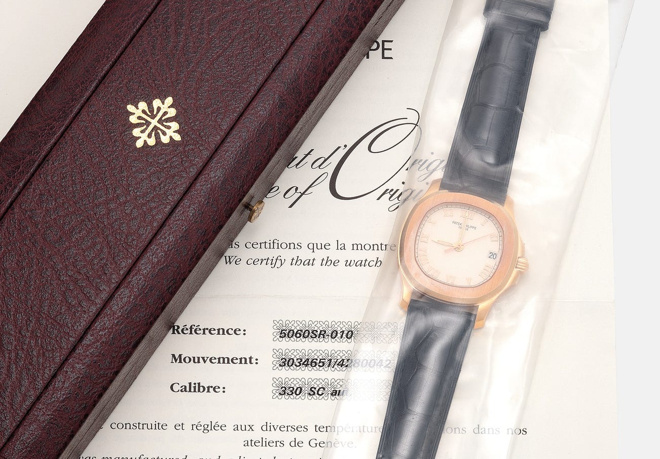 The present example is a rare ref. 5060SR-010 presented in unworn and new condition with the present watch being single sealed. Further adding to the attraction of this present piece, it is accompanied by the full set of accessories that was included with the watch when it was purchased by the original owner, such as the Certificate of Origin and the original presentation box.