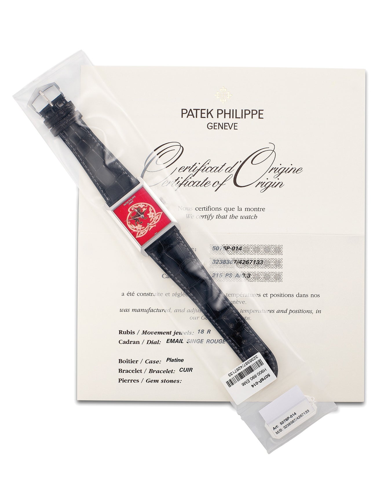 百達翡麗,非常精細,型號5076P-014,鉑金紅色掐絲琺瑯「靈猴蟠桃」腕錶,2004年製。附原裝錶盒、原裝證書。原廠單封全新品