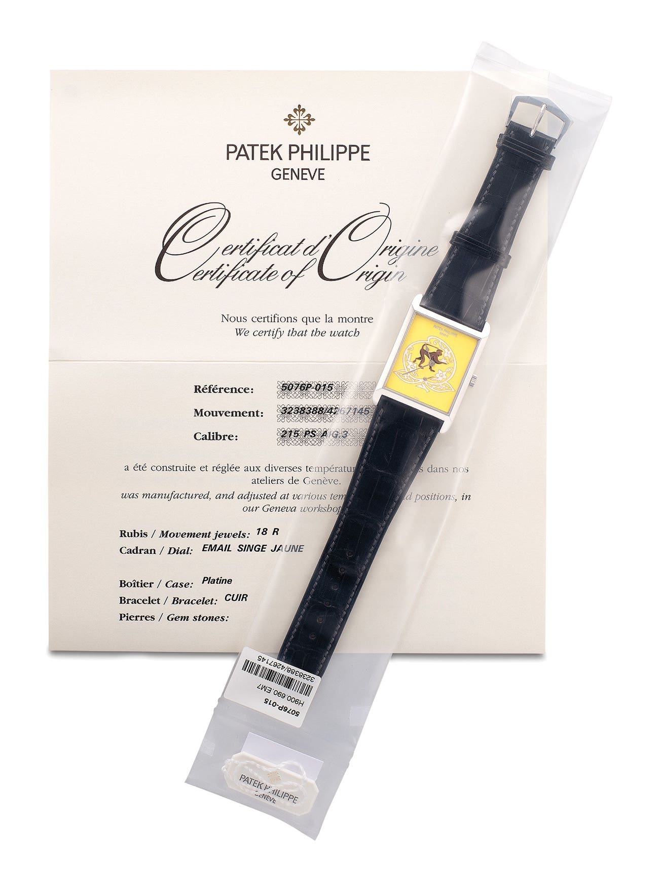 百達翡麗,非常精細,型號5076P-015,鉑金黃底掐絲琺瑯「靈猴蟠桃」腕錶,2004年製。附原裝錶盒、原裝證書。原廠單封全新品