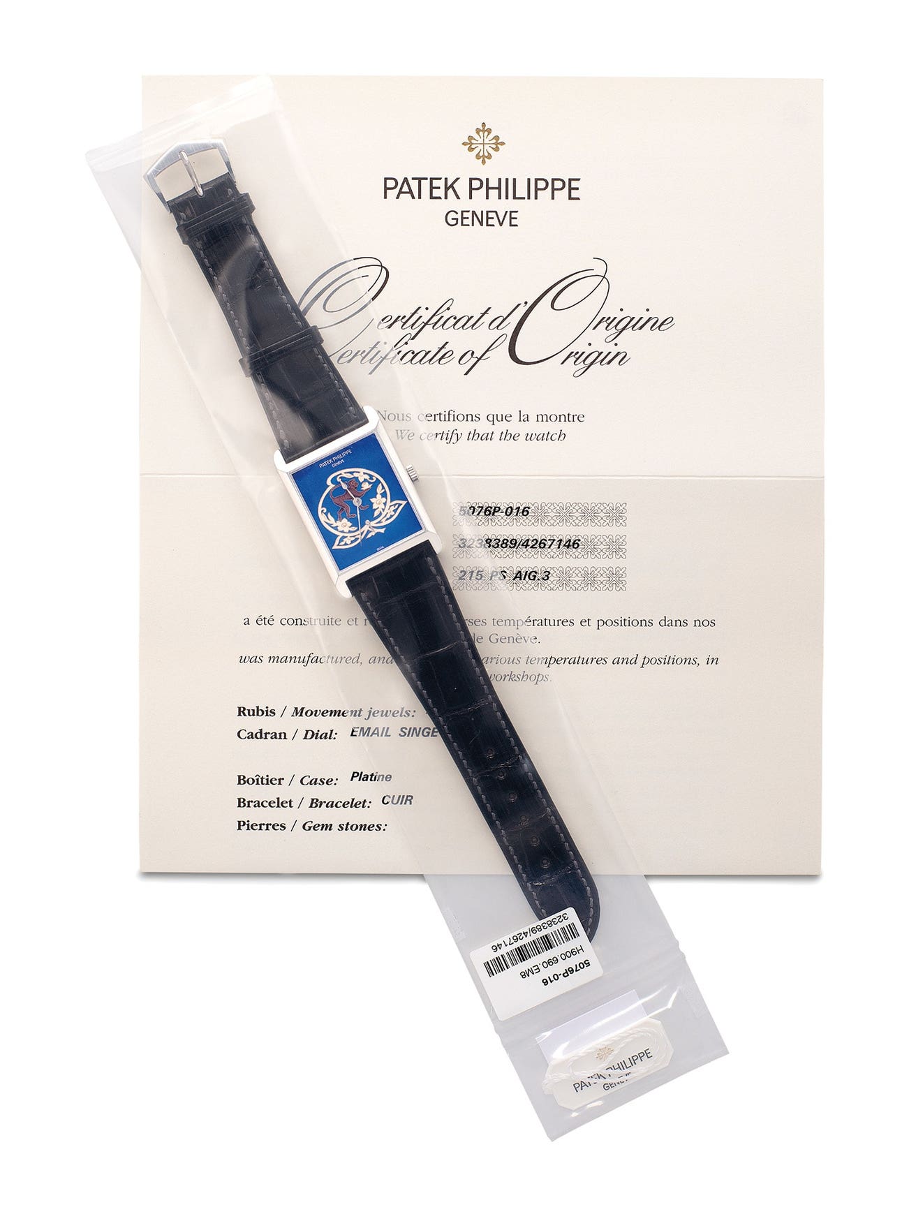 百達翡麗,非常精細,型號5076P-016,鉑金藍底掐絲琺瑯「靈猴蟠桃」腕錶,2004年製。附原裝錶盒、原裝證書。原廠單封全新品