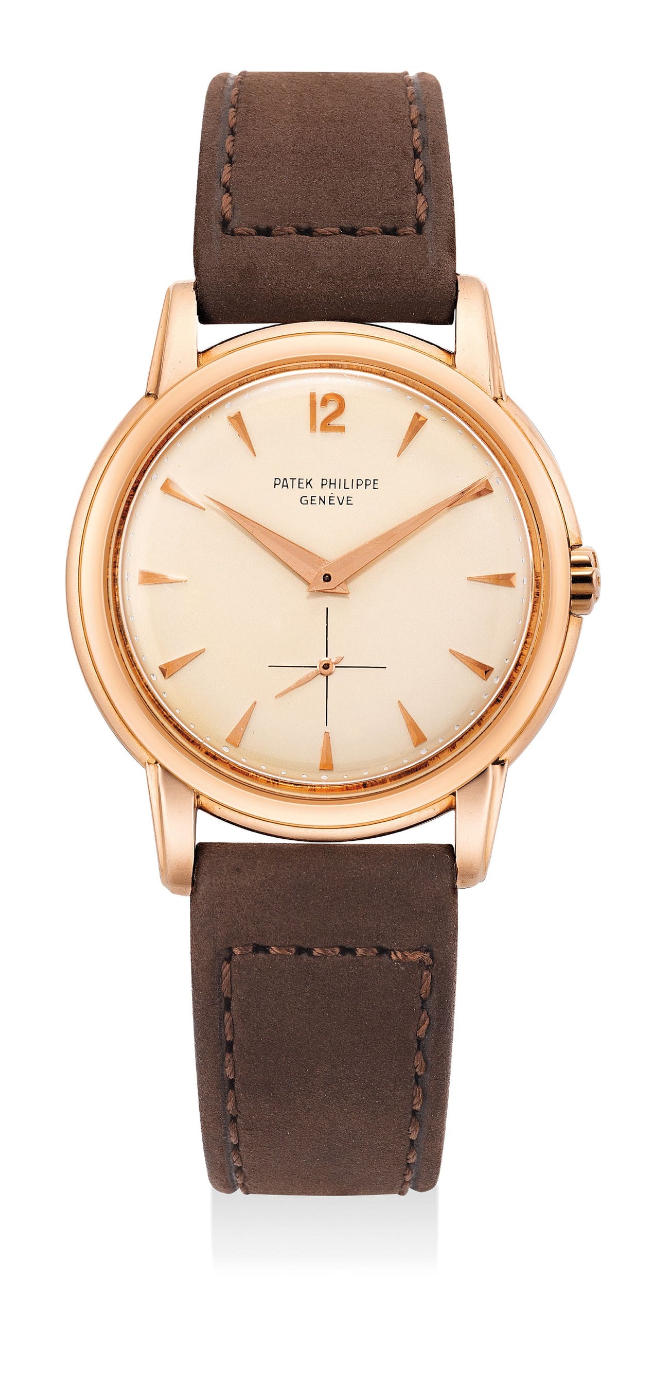 The present example, in pink gold, is fresh to the market, and has a dial “A” configuration featuring triangular hour markers with an Arabic 12 numeral and dauphine hands. It is believed that only 230 examples in total were made in pink gold with only 22 examples known in the market. The present example is presented in very nice overall condition, and is a wonderful example of the world-class design and engineering of Patek Philippe.