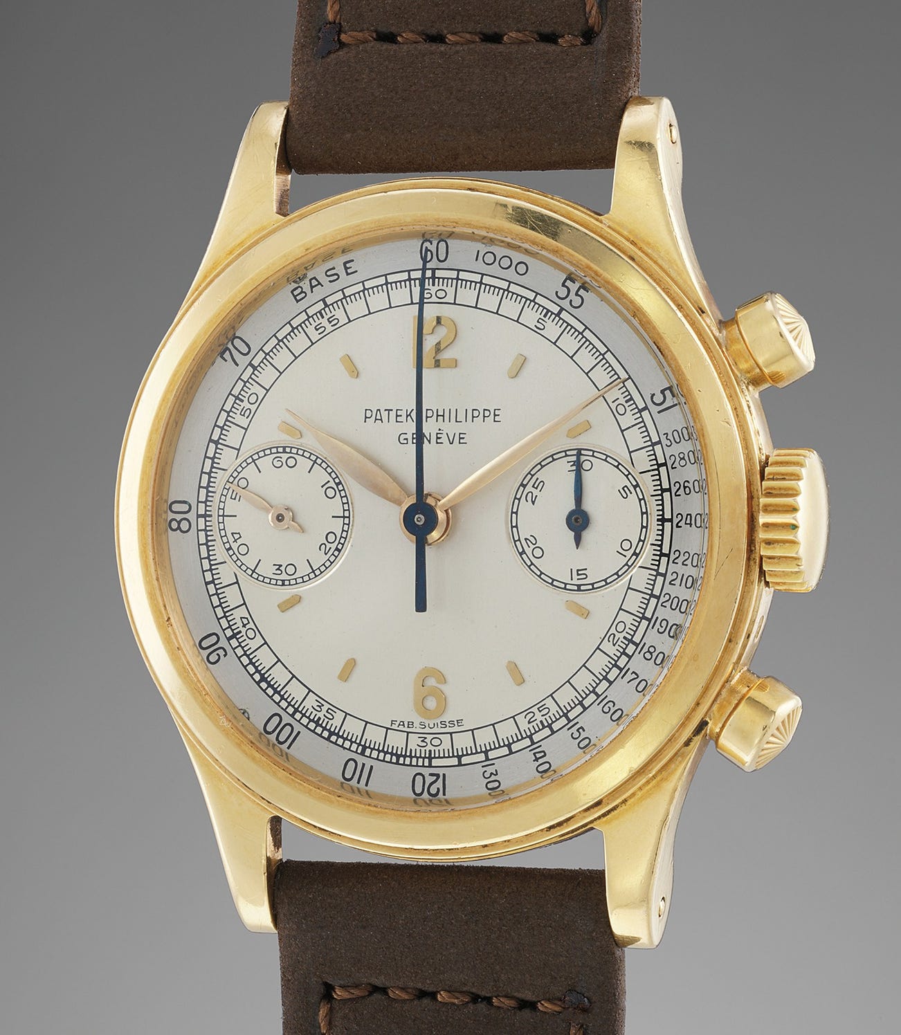 176 yellow gold reference 1463 models were known up till today and only 17 of them with a two tone silver dial. Only one other example was known until the discovery of the present watch with Fab. Suisse signature indicating that the watch was intended for the French market, this is confirmed by the JG hallmark on the caseback. JG stands for Jean Guillermin, a prominent French Patek Philippe retailer of the time.