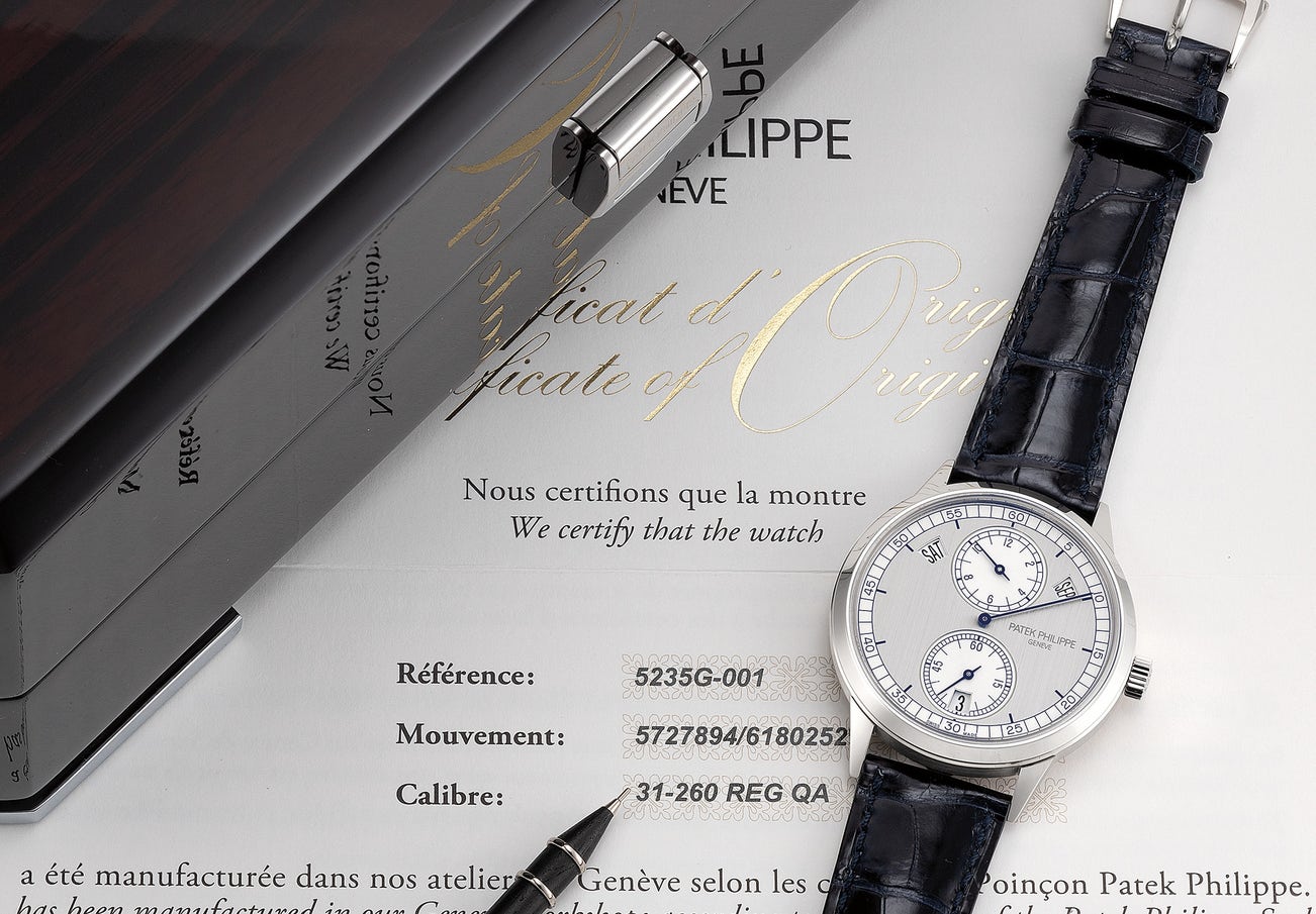 The present example is presented in overall excellent “like new” condition with very minimal signs of wear and further accompanied by the full set of accessories that was delivered with the present watch when it was purchased by the original owner from Italy. It is crucial to note that the production of 5235 in white gold has been discontinued, while the reference is now only encased in pink gold.