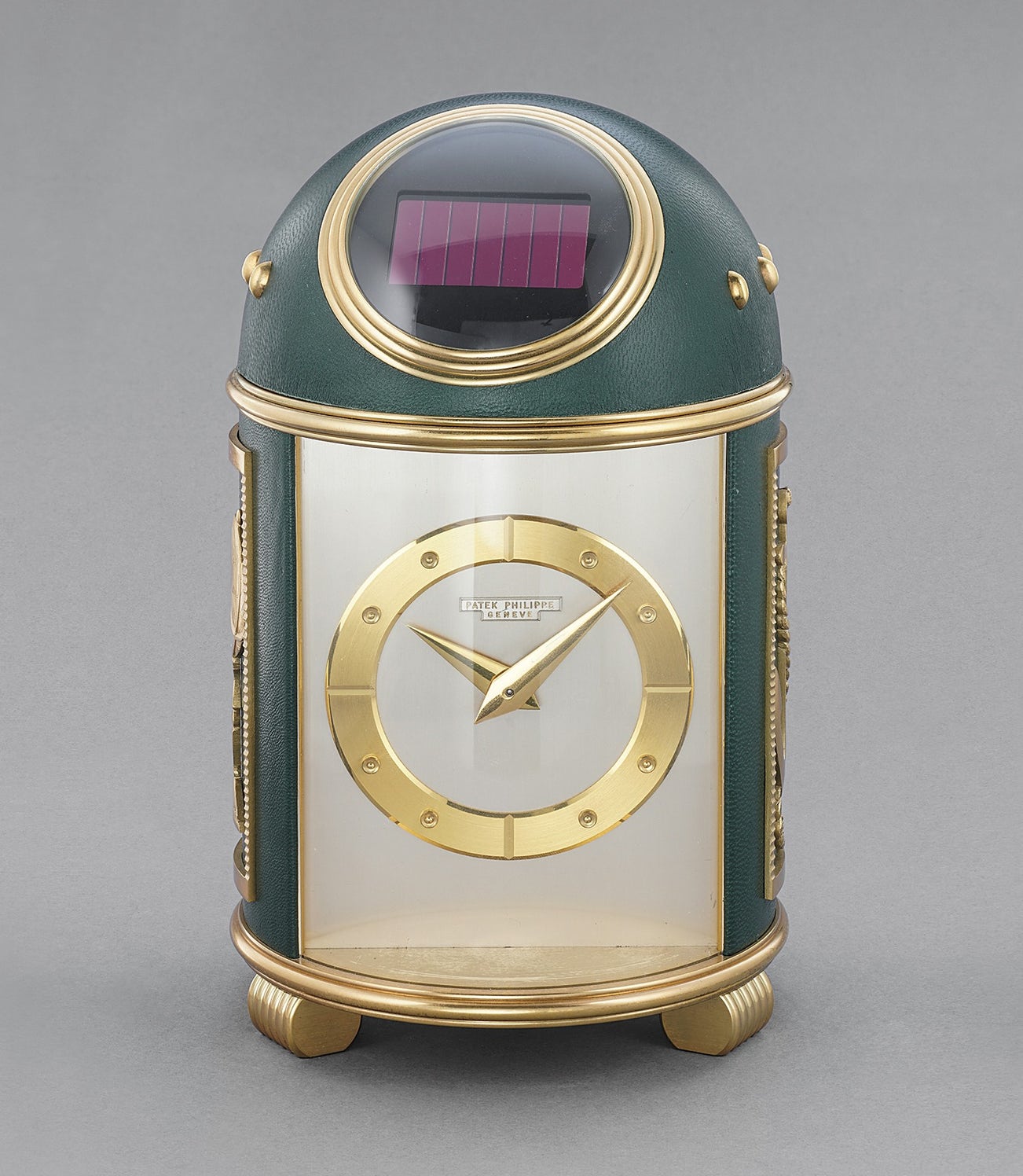 A rare and attractive gilt brass and green leather dome clock with applied marine-style gilt ornaments and presentation inscription