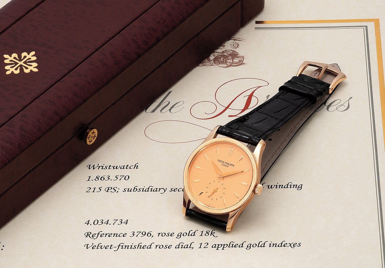 百達翡麗,型號3796,精細,18K玫瑰金配玫瑰金面盤腕錶,1999年製。附錶盒、原裝證書