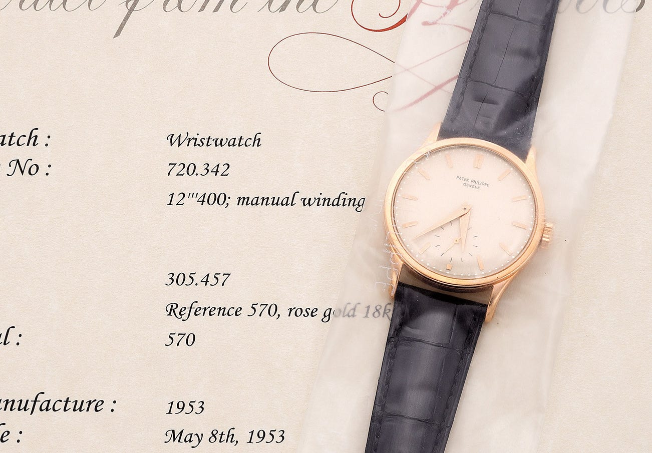 百達翡麗,型號570,非常精細,18K玫瑰金小三針腕錶,1953年製。附後補證書和保養收據,原廠保養單封