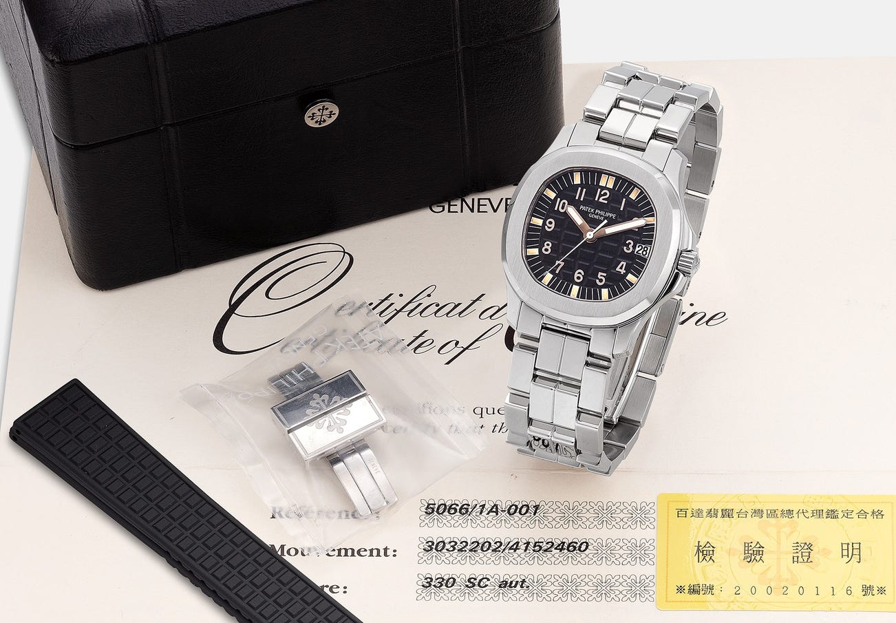 百達翡麗,型號5066/1A-001,精鋼自動上弦鏈帶腕錶,配日期和中心秒針,2002年製。附原裝錶盒、原裝證書、備用全新百達翡麗摺扣和備用全新膠錶帶