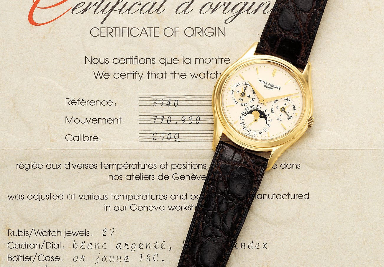 百達翡麗,型號3940,精細及罕有,18K黃金自動上弦腕錶,配萬年曆﹑24小時和月相顯示,1987年製。附原裝證書和後補證書